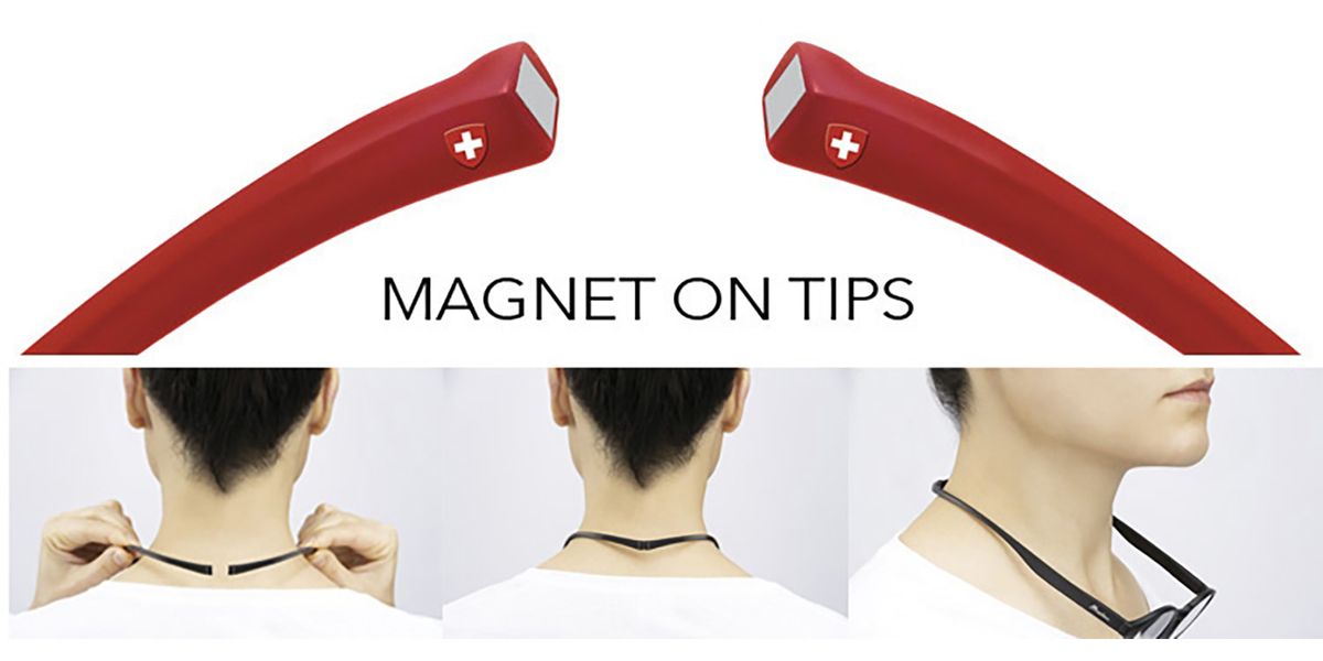 Deze leesbril blijft door de magneten aan de achterzijde altijd stevig om de nek hangen.